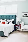 I sovrummet står en säng från Englesson. Väggarna är målade i färgen ”Stockholm Blue” från Zoffany. Kuddarna med bokstäver på är från Jonathan Adler.