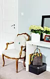 Det ärvda bordet och spegeln ger karaktär till rummet.