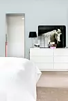 Överkastet och byrån är båda från Ikea. Hästbilden är från Green Apple. Den frostade dörren in till det nygjorda badrummet släpper in ljuset samtidigt som den ger integritet.