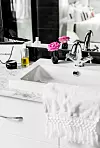 har handfat från Duravit. Kommoden har Liv själv designat. Carraramarmor ger rummet ett lyxigt intryck.