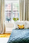 litet kök är nu ett trevligt gästrum. Sängkläder från Yves Delorme och gardiner från Green Apple.