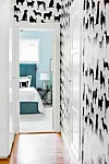 I gången mellan sovrummen har väggarna klätts med en hundtapet från Osborne & Little.