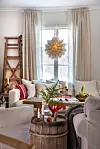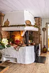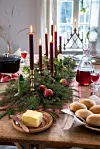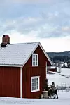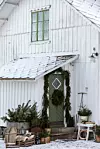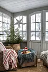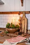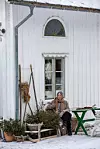 Till jul pyntar han mest med naturlig pynt, blandat med lite rött. Han gör girlanger av gran och torkade apelsinskivor, och hämtar små granar från egen skog. Han har flera tråg med röda äpplen, både ute och inne.