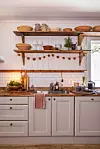 Köksinredningen är ett gratis fynd, det var bara att åka och hämta skåpen han behövde. Det var ett massivt furukök som Johan själv har målat ljusgrått.