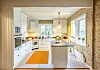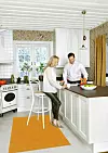 Köket har gott om ljusinsläpp, och de gräddvita luckorna förstärker det ljusa intrycket. Två ugnar är praktiskt. I andra änden av rummet finns kakelugnen samt kyl och frys. Matta, Castle, från Kasthall. Foto: Thomas Hjertén