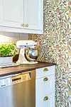 – Jag ville egentligen ha mörkgröna luckor, detaljer i blank mässing och skivor i vit marmor, men min man ställde sig ganska tveksam till den kombinationen. Vi enades om att välja vita luckor och i stället satsa på en mer färgrik tapet. Eftersom jag älskar William Morris mönstervärld så var valet enkelt – det fick bli tapeten "Fruit" som formgavs kring förra sekelskiftet. Då kallades mönstret "Pomegranate".