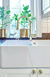 Kökshon i porslin är från Villeroy & Boch. Blandare i mässing, Nivito. Mjölkkannan i form av en ko kommer från franska Pillivuyt. Foto: Thomas Hjertén