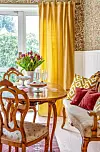 Framdukat i frukostmatsalen. Möblemanget från Lindome har paret ärvt av Mikaels farmor Ebba som tidigare drev antikaffär. Sammetsgardin från Jotex. Foto: Thomas Hjertén