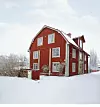 Det praktfulla huset sett från ena gaveln. Familjen valde klassiskt rött med ljusgråa gavlar och ockrafärgad ytterdörr.