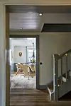 Trappan till de övre våningarna är i samma träslag som brädgolven i resten av huset. Trappräcket och samtliga dörrkarmar i huset är målade i en grå färg. Spottar i taket och ljusslinga runt trappräcket höjer mysfaktorn ytterligare under vintertid.