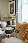 Pläd och kuddfodral med ormmotiv från Room. I bakgrunden en loppisfyndad brun urna.