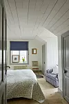 Rymligt sovrum på översta våningen. Sänglinnet och mattorna kommer från Ellos. Väggprydnaden ovanför sängen är köpt i butiken Magasinet i Vaxholm.