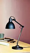 Punktbelysning är praktiskt på skrivbordet. Flera ljuspunkter i rummet bidrar också till en hemtrevlig känsla. Klassisk armatur i uppdaterad form för arbetsplatsen, från Jysk.