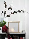 Många lyktor på rad på ett sideboard tillsammans med lärk ger stämning. Diska ur sylt- eller matburkar och ta bort etiketterna. Klä in dem med transparent papper, bokmärken och klippta röda stjärnor. Böj till kopparfärgad najtråd som burkarna kan hängas upp i.