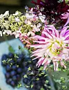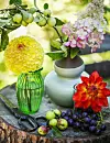 Du behöver inte många blommor för att skapa sensommarstämning inne. Samla ett par dahlior, en hortensia och en kvist paradisäpple i små vaser på en bricka med en klase druvor. Den klotrunda, gula dahlian hör till gruppen Boll och sorten heter ’Blyton Softer Gleam’.