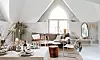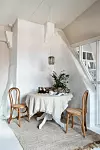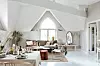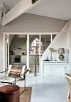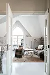 Vindsvåningar kan vara både mörka och svårmöblerade, men det finns undantag. När man kliver över tröskeln till denna tornvåning i Linnéstaden i Göteborg möts man direkt av en ljus och rymlig känsla. I halltaket sitter ett takfönster strategiskt placerat, och det vitmålade golvet, de varmt beige halvväggarna och de ljusa takpartierna i det kombinerade mat- och vardagsrummet ger ett luftigt och nästan skinande intryck.