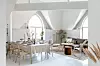 Ljuset strömmar in genom det spetsiga fönstret i vardagsrummet. Matbordet och stolarna är köpta på Ilva, linneduk, Zara Home.