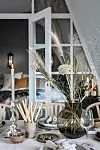 De tycker om att låta årstiderna synas inomhus och inreder gärna med säsongsbetonade växter. På matbordet syns vilda växter i glasvas från Ernst. Silverljusstake från loppis.