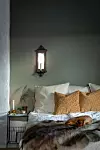 Sovrummets väggar är målade i nyansen ”Dusky le Havre”, Nordsjö. Överkast och renskinn, Hemtex, stora kuddar, Ikea. Väggljusstakarna är köpta i butiken Karl Fredrik på Eklaholm.