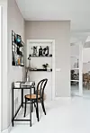 I den rymliga hallen fick paret plats med en skrivbordshörna. Stol loppis, skrivbord Ikea. Dörren som leder in till parets garderob används inte, så de placerade två hyllor från Søstrene Grene i dörrhålet.