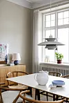 målat med färgen Vit te från Jotun för att tillföra lite värme till rummet, som är inrett med ekmöbler