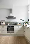 förvaring för köksutrustning och matvaror, samt bänkutrymme för köksmaskiner. Lådor och hyllor