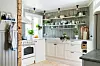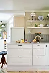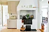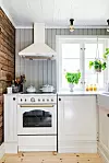 Köket är Ulla-Karins favoritplats. Här tänds en brasa i vedspisen under kulna dagar och det är härligt att slå sig ner och lyssna till sprakandet. Vedspisen och kakelugnarna är de enda värmekällorna i huset, förutom ett element som installerades i badrummet när det renoverades.