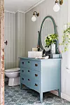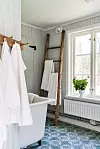 – Med badkaret på plats så blev badrummet både praktiskt och vackert. Golvet med de spanska plattorna i dova blå nyanser och den gamla spegelbyrån gör att rummet känns både personligt och ombonat, säger Ulla-Karin. A