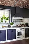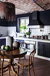 Kakelplattorna i köket är klassiska, handmålade små konstverk från Piemonte och sattes upp av husets förra ägare. Kopparkittlarna tillhörde Lillians mamma. Köket var från början knallblått, paret valde att måla om det i en svart kalkfärg som heter Black Truffle, nyansen fungerar väldigt bra mot den varma terrakottan.