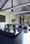 Sofforna från Tine K Home specialbeställdes så att hela stora familjen skulle få plats. Glashyllorna fanns i huset när de flyttade in. Stilen i byggnaden är rustik vad gäller tak, väggar och golv, detta kombineras fint med moderna detaljer och skandinavisk stil på möblerna.