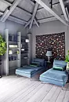 Två dagbäddar inbjuder till härliga stunder. Hyllan är skräddarsydd och har hyllplan i glas. Det målade taket bidrar till en spännande helhet.