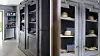 Glasrutorna är bortplockade från skåpsdörrarna och ersatta med hönsnät. I skåpet förvaras solhattar.