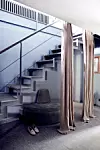 Det är italiensk marmor på golvet i hallen och i trappan som leder upp till andra våningen. Puffen är från Tine K Home och de långa linnegardinerna är från Ikea.