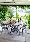 Terrassen har utsikt över gamla olivlundar och hundra år gamla valnötsträd, vingårdar och åkrar. På klara höstdagar skymtar man de snötäckta alperna i fjärran. Det runda bordet är tillverkat av italiensk granit och är en gåva till Lillian från husets tidigare ägare.