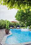 Poolen var den första i byn och det pratas fortfarande om hur den flögs in med helikopter. I dag har Lillian och Rune, deras barn och barnbarn det trevligt här. Bredvid poolen står valnötsträdet, och på hösten hörs dunsande ljud när nötterna faller ner. Solsängar och bord, Tine K Home.