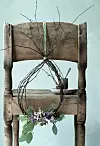 5. Fortsätt binda 1–2 kvistar vid kransen åt gången – kom ihåg att binda blommor på in- och utsidan av kransen också. Fortsätt med att binda blommor hela vägen runt. Gör ett osynligt avslut genom att sticka in stjälkarna under de första blommorna. Bind ett band runt kransen som upphängning. Du kan göra en nättare krans genom att använda kortare kvistar.