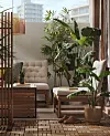Förutom textilier så är gröna växter en viktig nyckel till en lyxigare och mer ombonad uteplats. Satsa på några få lite större i stället för jättemånga mindre för att spara pengar. Och välj sådana som är gröna länge under säsongen. Håll även utkik i Facebook-grupper och på Blocket där växter ibland skänks bort.
