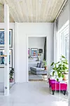 Det var bara att kavla upp ärmarna, inventera husets alla tidstypiska 1970-talsdrag och bestämma vad som skulle elimineras och vad som skulle vara kvar. Vit färg sveptes över alla furuklädda väggar och tak. I köket revs den gamla inredningen ut och ersattes med ny, samtidigt som öppningen flyttades mot hall och vardagsrum. För övrigt är båda två galet nöjda med beslutet att flytta upp tvättstugan från källarplan. Nu slipper de springa upp och ner med tvättkorgar och kan bara öppna altandörren när det är dags hänga tvätt – vilket det är för jämnan.