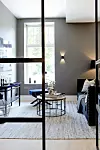 De specialtillverkade järndörrarna med glas från golv till tak ger lägenheten karaktär och bevarar den luftiga känslan i rummet. Dörrarna är designade av Bonums inredningsarkitekter. Kuddar, Missoni Home.