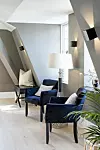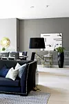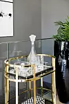Lägenhetens inredning kombinerar exklusiva material i ek, sammet, bladguld och glas.