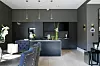 Det svarta köket i trä kommer från Ballingslöv. Att inte välja kakel mellan överskåp och bänkskåp är ett medvetet val. Genom att i stället sätta upp en glasskiva som stänkskydd kan lägenhetsinnehavaren ändra färgen på väggen efter egen smak.
