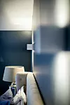 Färgen som använts i stort sett i hela lägenheten är ”1462 Grå Skiffer” från Jotun Lady. De snygga vägg­lamporna heter ”Birk LED” och kommer från det norska företaget MS belysning. Samma typ av lampa har använts på många ställen i lägenheten.