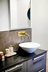Mässings­blandarna i badrummet är tidsenliga och eleganta.