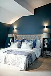 Den blå kulören på väggarna och de stora mjuka möblerna gör att hela sovrummet känns ombonat. Sänggavel och sängkläder i linne.