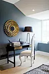 Den mörka, mättade färgen på väggen ger rummet karaktär och djup. Detaljer i guld kompletterar det eleganta intrycket.