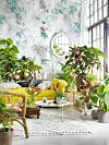 Tapet ”Faded Passion”, 2 560 kr/rulle, Sandberg. Spegel, 799 kr, lampa, 999 kr, båda från Mio. Kanna, 1 399 kr, kopp med fat, 399 kr, båda från Wik & Walsøe. Dagbädd ”Couch 775”, 44 340 kr, Svenskt Tenn. Vitt soffbord, 6 288 kr, Asplund. Mörkt träbord, 995 kr, Soulosofie. Glasburk med lock, 69 kr, burk med mässingslock, 59 kr, båda från Mio. Fåglar på stativ, 275 kr/st, inreda.com. Fåtölj, 2 295 kr, Ikea. Kuddfodral med fransar, 439 kr, blått kuddfodral, 489 kr, båda från Jakobsdals. Kuddfodral med prickar, 750 kr/st, Villagatan 1. Matta, 3 690 kr, Classic Collection. Bänk, 995 kr, Ikea. De gröna växterna är gullranka på ett stöd av kokosfiber, bergpalm, adiantum, mose stentavlor, spadranka, ormbunke och monstera. Alla växter och krukor från Blomsterlandet. Foto: Karl Anderson