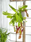 Skönt häng för insektsätande kannranka. Ampel, 59 kr, Blomsterlandet. Gardin, 1 199 kr/par, Ellos. På golvet bergpalm. Foto: Karl Anderson