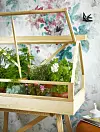 Samla dina ömtåligaste växter och frösådder i ett skyddat litet rum. Här frodas fjädersparris, rosmarin, azalea och pelargon. Växthus på stativ ”Greenhouse”, 7 900 kr, Design House Stockholm. Fåglar, från 199 kr, Pottery Jo. Puff, 2 290 kr, Hem Design Studio. Vit vas, 150 kr, Kristina Stark. Foto: Karl Anderson