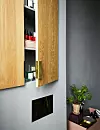 Det inbyggda skåpet har dörrar i ekträ, och handtagen i mässing är tillverkade efter Anes önskemål. Spolknappen i mässing från Vola matchar kranarna i badrummet.