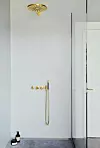 Duschhörnan är extra djup så man ska slippa duschdraperi. Glasväggen är specialtillverkad hos INR, duschblandare från Vola.